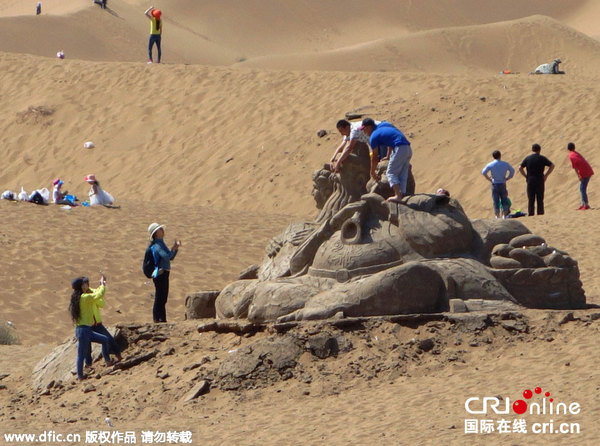 2015年5月2日,新疆吐鲁番,五一黄金周期间,新疆吐鲁番鄯善县库木塔格沙漠风景区游客人数剧增,高温下的大漠风光、沙漠中神态各异的沙雕作品,吸引游客流连忘返。遗憾的是,一些游客不听从景区管理人员劝告,肆意攀爬沙雕拍照留念,导致许多座沙雕作品遭到严重毁坏,有的已经完全坍塌,面目全非,已无法修复。图片来源:东方IC