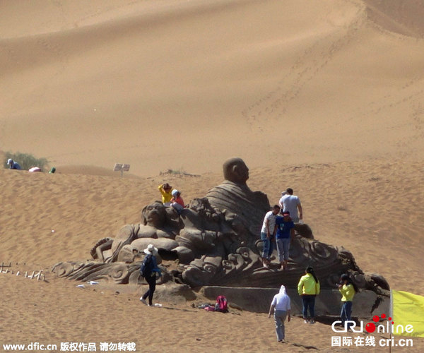 2015年5月2日,新疆吐鲁番,五一黄金周期间,新疆吐鲁番鄯善县库木塔格沙漠风景区游客人数剧增,高温下的大漠风光、沙漠中神态各异的沙雕作品,吸引游客流连忘返。遗憾的是,一些游客不听从景区管理人员劝告,肆意攀爬沙雕拍照留念,导致许多座沙雕作品遭到严重毁坏,有的已经完全坍塌,面目全非,已无法修复。图片来源:东方IC