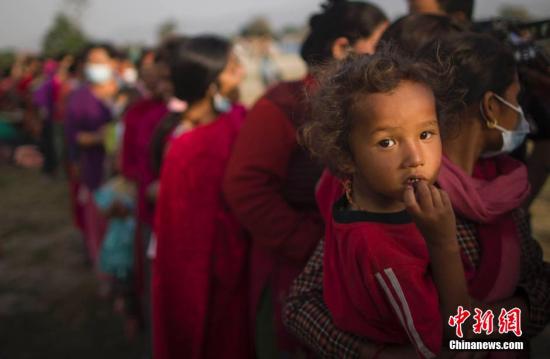 5月1日,民众在加德满都排长队领取生活物资。当日是尼泊尔强震发生的第七日,截至北京时间4月30日晚,尼泊尔强震已致该国死亡人数接近5900人,死伤人数仍在继续上升。联合国人道主义救援机构等呼吁国际社会向尼泊尔紧急捐助4.15亿美元,帮助尼泊尔政府向地震受灾民众提供人道主义救援。灾区目前有50万人被迫在户外露宿,急需帐篷、饮用水和基本医疗资源。中新社发 张浩 摄