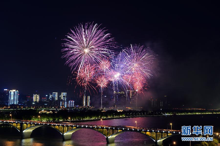 这是长沙橘子洲2015首场周末音乐焰火晚会现场(5月2日摄)。 5月2日晚,湖南省长沙市在湘江橘子洲举行2015首场周末音乐焰火晚会,这是橘子洲音乐焰火晚会举行的第6年度第198场。据悉,2015年长沙橘子洲周末音乐焰火晚会从5月2日持续至10月31日(遇重大节日将有调整),将安排27场次。新华社记者 龙弘涛 摄