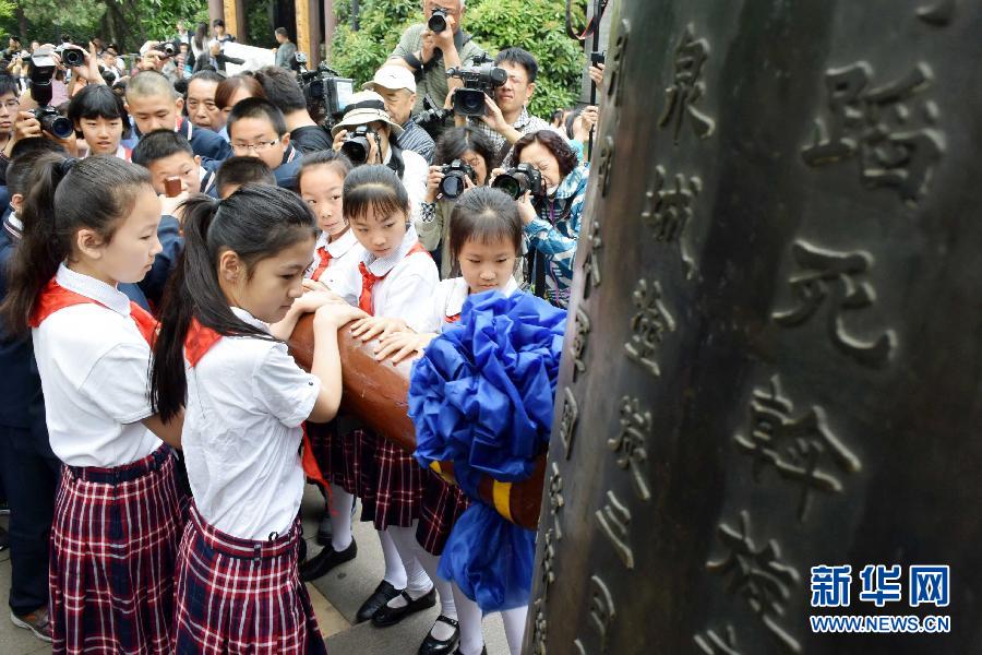 5月3日,济南青龙街小学学生敲响纪念钟,警示后人牢记历史。当日是“五三惨案”87周年纪念日,群众来到山东济南趵突泉公园内的济南惨案纪念堂前,追忆历史,缅怀先烈。 1928年5月1日,当国民革命军北伐进占济南时,日本侵略者以“保护侨民”为借口,出兵干涉,并于5月3日凶残地杀害了国民政府山东特派交涉员蔡公时等17名外交人员,进而强占全城,恣意杀戮了中国士兵和市民近万人,制造了震惊中外的济南“五三惨案”。新华社记者 朱峥 摄