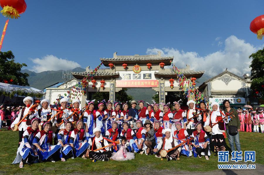 5月3日,身着传统服饰的当地群众在开幕式前合影。当日,2015年云南省大理白族自治州三月街民族节开幕。本届三月街民族节为期7天,将进行赛马大会、少数民族传统运动会、原生态歌手大赛等活动。新华社记者 胡超 摄