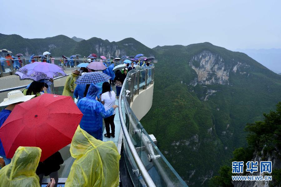 5月3日,游人在重庆市云阳县龙缸景区玻璃廊桥游玩。新华社发(宋文 摄)