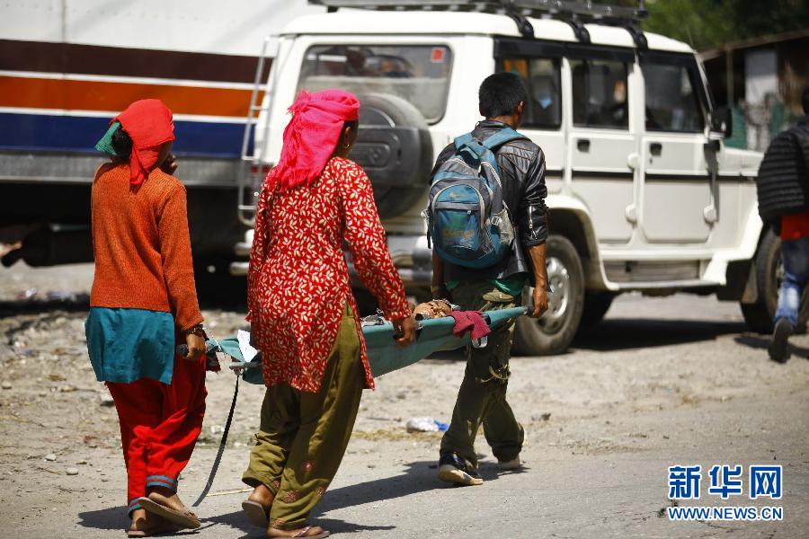 5月3日,在尼泊尔的辛杜帕尔乔克,人们搬运一名伤者去接受治疗。尼泊尔内政部3日公布的最新数据显示,该国4月25日发生的强烈地震已造成7056人死亡,14123人受伤。 新华社发(普拉塔普·塔帕摄)