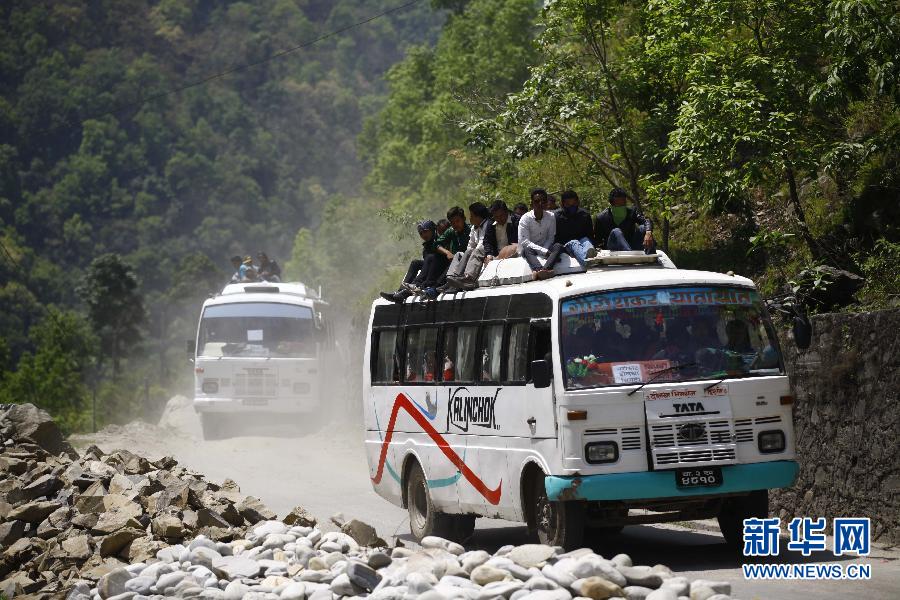 5月3日,在尼泊尔的辛杜帕尔乔克,人们乘车回到家乡。尼泊尔内政部3日公布的最新数据显示,该国4月25日发生的强烈地震已造成7056人死亡,14123人受伤。 新华社发(普拉塔普·塔帕摄)