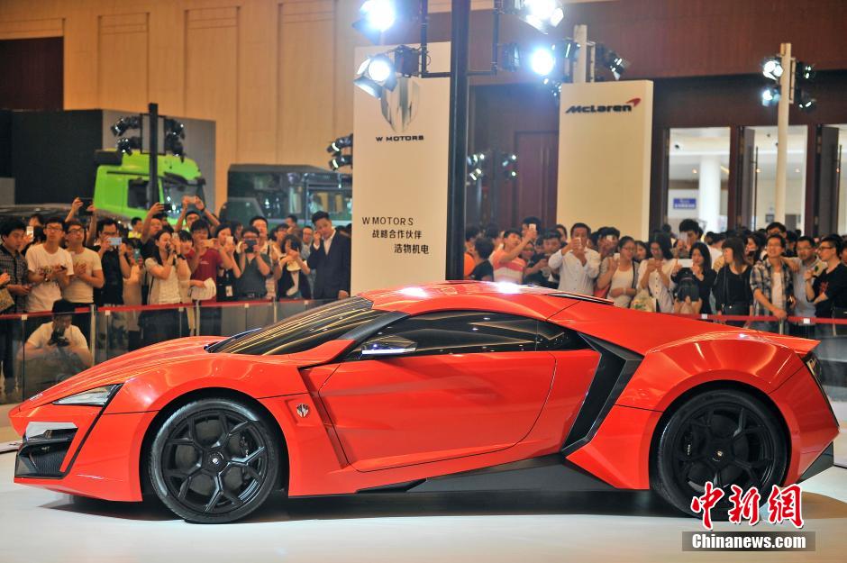 5月1日,电影《速度与激情7》中价值9500万的豪奢跑车Lykan Hypersport首次亮相天津国际车展,吸引了众多游客的目光。Lykan Hypersport是由阿拉伯世界第一家超跑制造商W MOTORS 生产,全球仅有7辆,车灯由白金,钻石,蓝宝石打造,为全球最贵的跑车之一。五一小长假首日,8万余人来到一年一度的天津国际车展参观。中新社发 佟郁 摄
