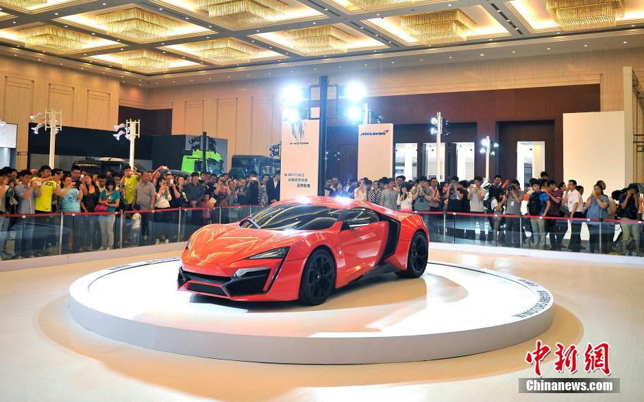5月1日,电影《速度与激情7》中价值9500万的豪奢跑车Lykan Hypersport首次亮相天津国际车展,吸引了众多游客的目光。Lykan Hypersport是由阿拉伯世界第一家超跑制造商W MOTORS 生产,全球仅有7辆,车灯由白金,钻石,蓝宝石打造,为全球最贵的跑车之一。五一小长假首日,8万余人来到一年一度的天津国际车展参观。中新社发 佟郁 摄
