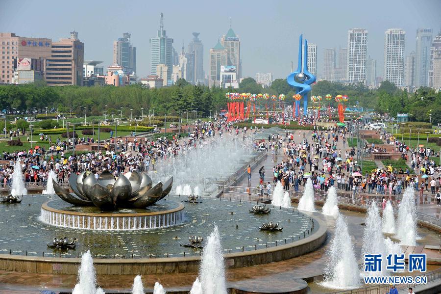 众多游客在济南泉城广场游览(5月1日摄)。山东省旅游局数据显示,“五一”小长假期间,山东共接待游客2809.2万人次,旅游综合收入211.7亿元,同比增长均超10%。新华社记者 朱峥 摄