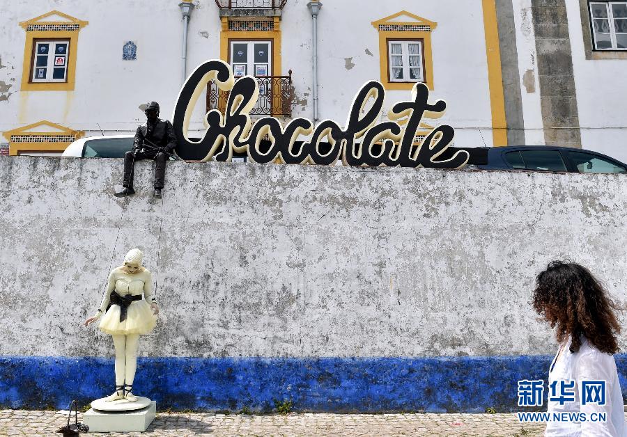 5月3日,在葡萄牙奥比杜什街头,一名过路人观看两名身着巧克力服装的模特。第13届奥比杜什国际巧克力节3日在葡萄牙中部历史名城奥比杜什落下帷幕,各式栩栩如生、色香俱全的巧克力雕塑,引得参观者惊叹不已。新华社记者张立云摄