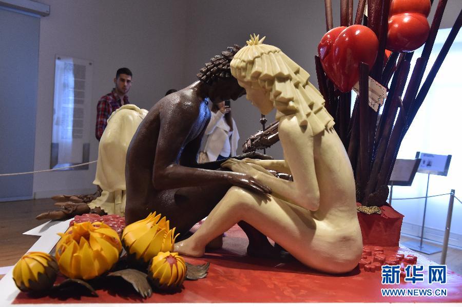这是5月3日在葡萄牙奥比杜什拍摄的一座情侣题材的巧克力雕像。第13届奥比杜什国际巧克力节3日在葡萄牙中部历史名城奥比杜什落下帷幕,各式栩栩如生、色香俱全的巧克力雕塑,引得参观者惊叹不已。新华社记者张立云摄