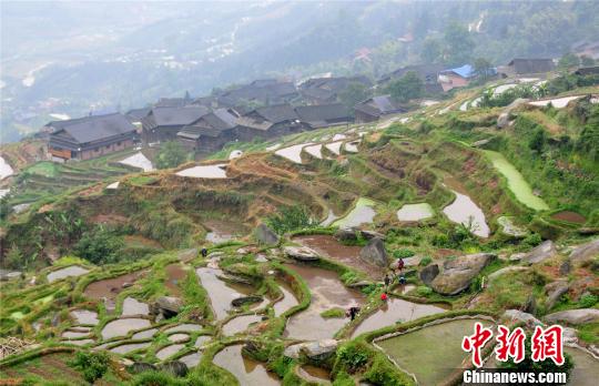5月3日,广西三江侗族自治县老堡乡村民正在进行春耕。立夏将近,降雨增多,桂北侗乡进入水稻春耕春种的大忙季节,稻田在农民忙碌身影的点缀下宛若画卷。