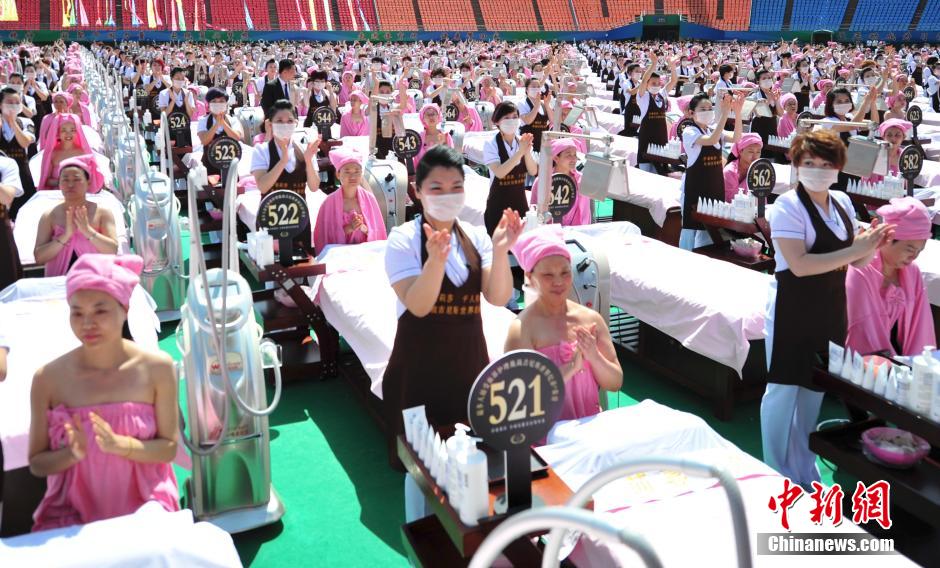 5月4日,千名美容师与千名做面部护理女士庆贺挑战吉尼斯纪录成功。 中新社发 张勇 摄