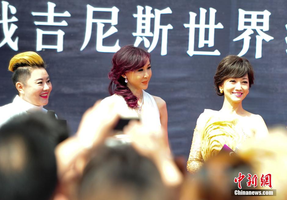 5月4日,赵雅芝(右一)、萧蔷(右二)见证吉尼斯世界纪录英国总部认证官颁发证书认证纪录诞生。中新社发 张勇 摄