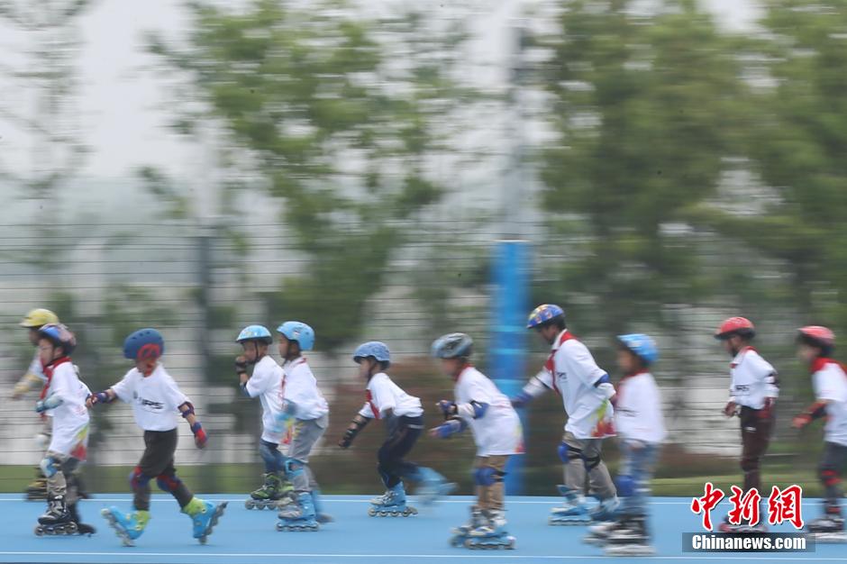5月4日,小朋友们在南京鱼嘴湿地公园内“刷街”。当日,以“欢聚博爱之都,共享轮滑快乐”为主题的南京2015轮滑活动周启动,轮滑运动爱好者、高校大学生、小学生等一千余人随着动感的音乐共同轮滑“刷街”,同时进行各式轮滑表演,为2016年将在南京举办的世界速度轮滑锦标赛预热。 中新社发 泱波 摄