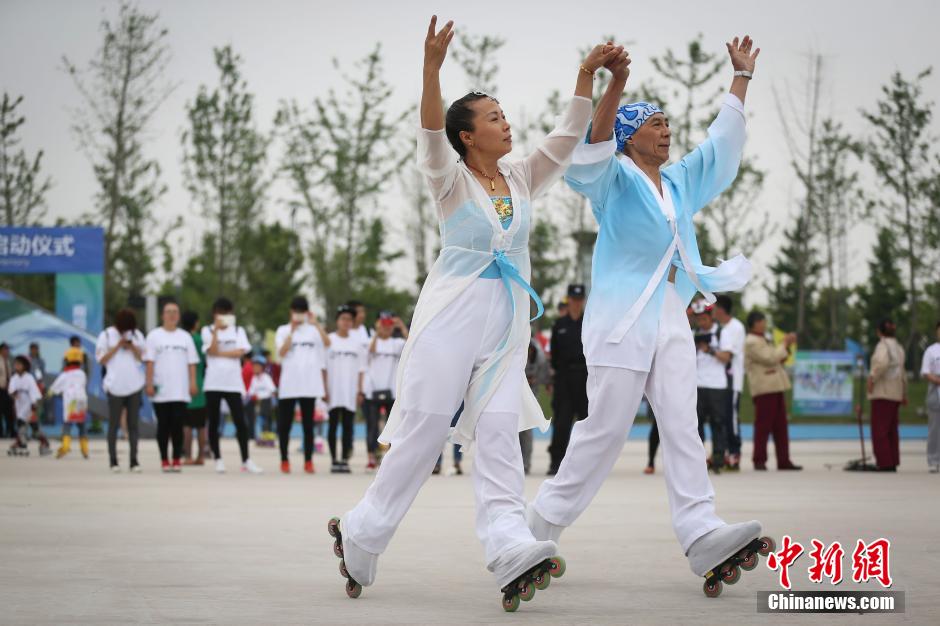 5月4日,轮滑爱好者在南京鱼嘴湿地公园内表演轮滑舞。 中新社发 泱波 摄