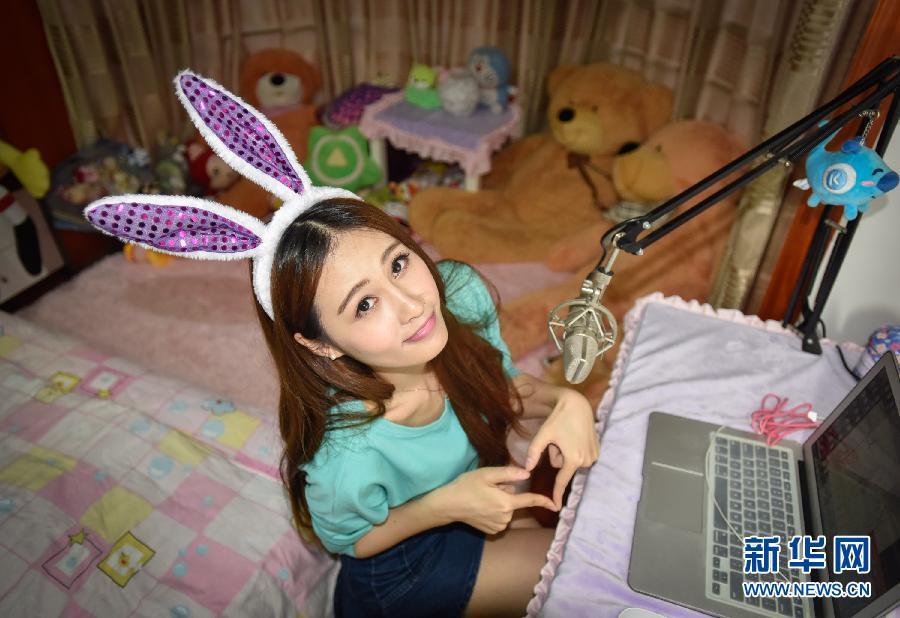 燕子在自己的房间内上线直播(4月28日摄)。燕子成为网络主播已经10个月了,最高一个月收入近2万元,现在她在广州租金较高的珠江新城租住,方便实习和直播。