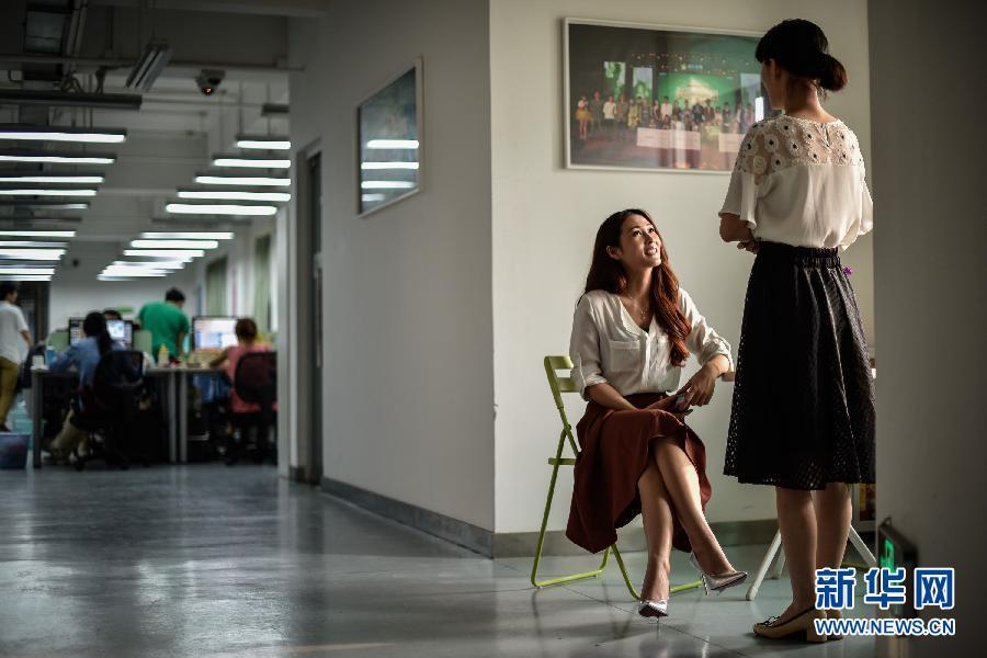 燕子(左)定期回公司和繁星网的主播管理人员交流,了解公司的最新规定和数据部门对自己粉丝变化的技术分析(4月27日摄)。新华社记者 刘大伟 摄 图片来源:新华网