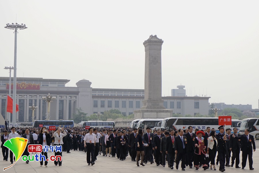2015年庆祝“五一”国际劳动节暨表彰全国劳动模范和先进工作者大会前,广东团列队入场。中国青年网记者 李正穹 摄