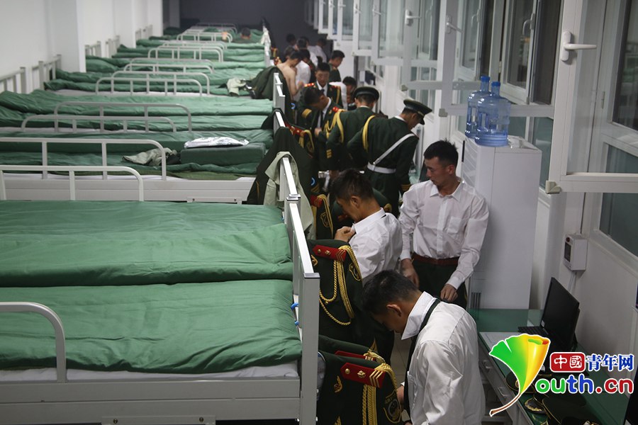 凌晨3时50分随着一声嘹亮的哨音,国旗护卫队队员们立即起床,穿着衣服,整理内务,为今天的升旗任务做准备。 中国青年网通讯员 牛成浩 摄
