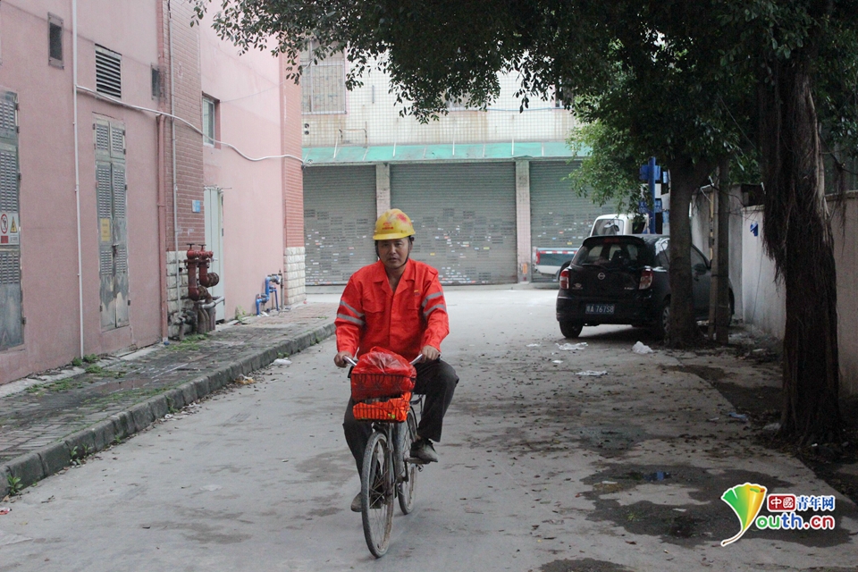 早上6点半,简单吃完早饭,老胡骑上自己心爱的自行车奔赴工地。自行车是他从二手市场淘来的,花了50元,他一天工资的1/3,每天骑着它,来回4公里上下班。中国青年网通讯员 张喆 摄
