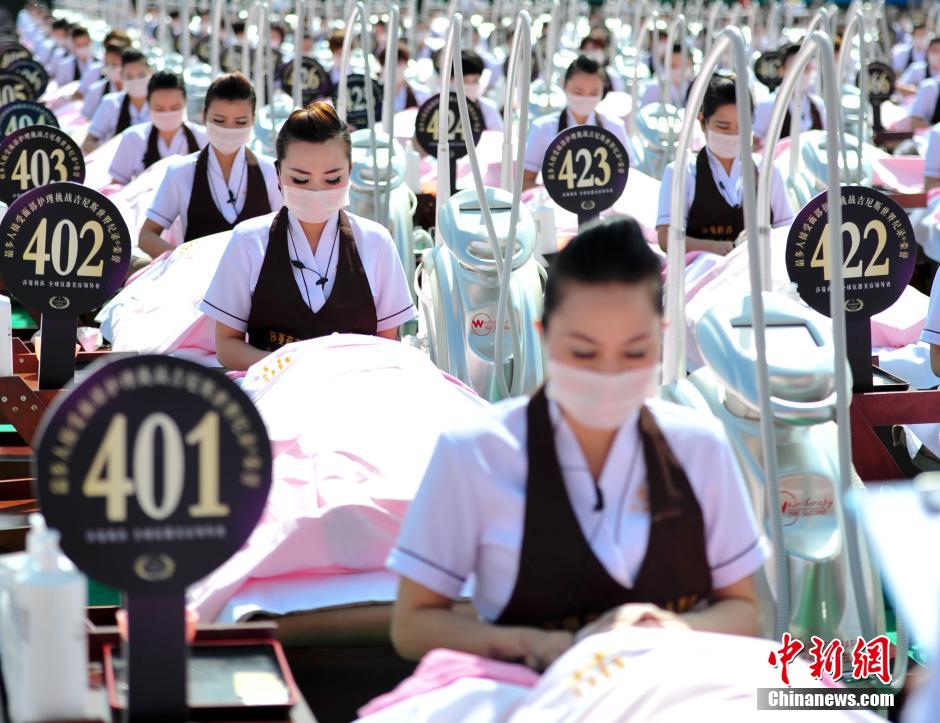 5月4日,千名美容师为千名女士做面部护理。 界纪录英国总部认证官颁发证书认证纪录诞生。 中新社发 张勇 摄