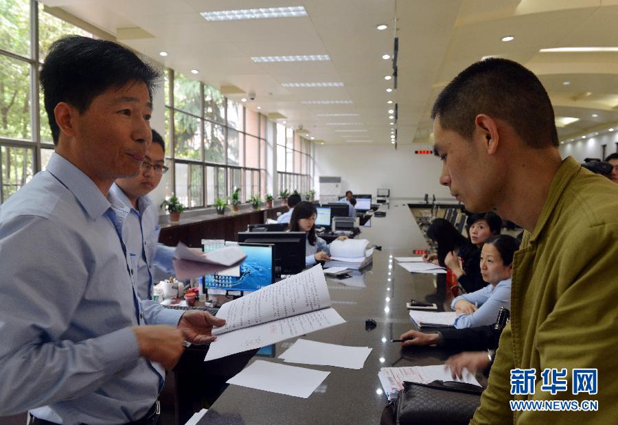 5月4日,安徽省蚌埠市中级人民法院诉讼服务中心工作人员向当事人介绍立案登记制度。当日是我国法院实施立案登记制后的首个工作日,各地法院增开立案窗口、增配立案工作人员接待诉讼群众。中央全面深化改革领导小组第十一次会议审议通过的《关于人民法院推行立案登记制改革的意见》从今年5月1日起正式施行,变立案审查制为立案登记制,对依法应该受理的案件,做到有案必立、有诉必理,保障当事人诉权。新华社发(高建业 摄)