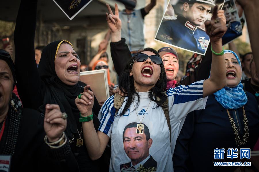 5月4日,在埃及首都开罗,穆巴拉克支持者在集会上高喊口号。当日,埃及前总统穆巴拉克的支持者在其受到软禁的开罗南部马阿迪军事医院外举行集会,庆祝他的87岁生日。 新华社记者 潘超越 摄