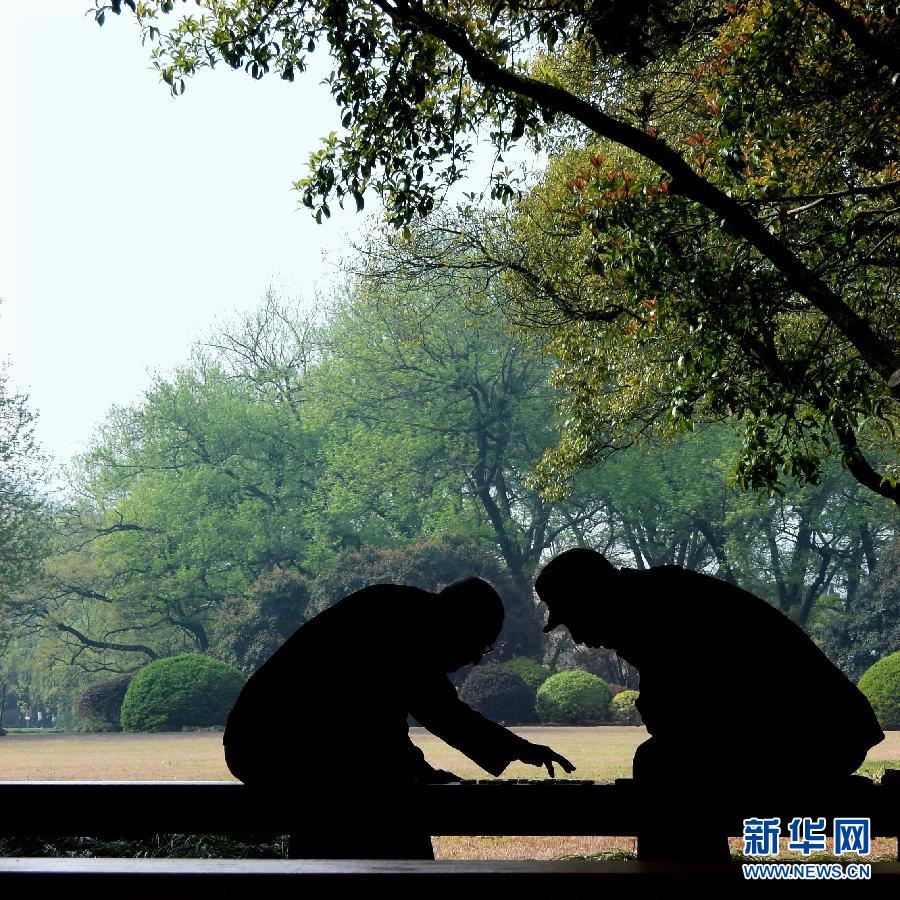 两位老人在西湖岸边的一处亭廊内下棋(2015年3月29日摄)。新华社记者 王颂 摄