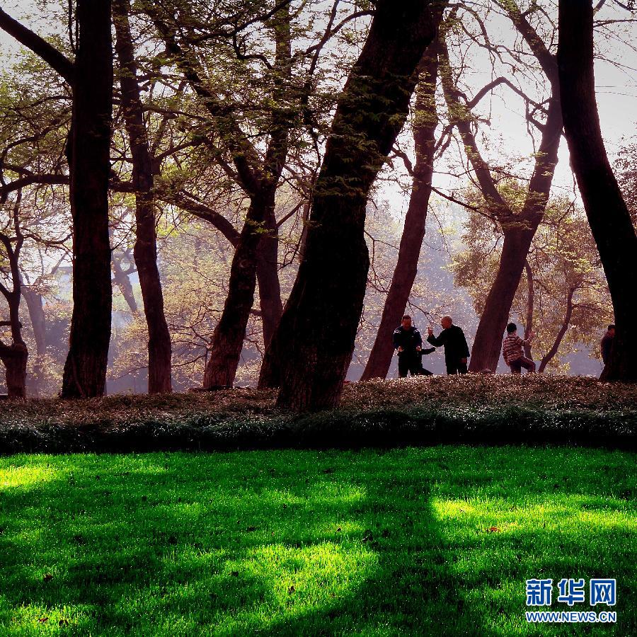 几位市民在西湖岸边的树荫下锻炼健身(2015年3月29日摄)。新华社记者 王颂 摄