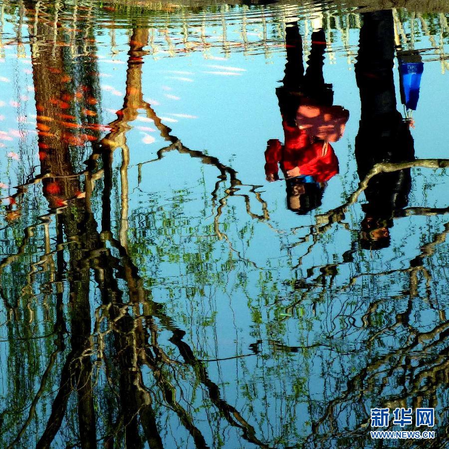几位游客在西湖岸边的一个公园内观赏水中的金鱼(2014年3月22日摄)。新华社记者 王颂 摄