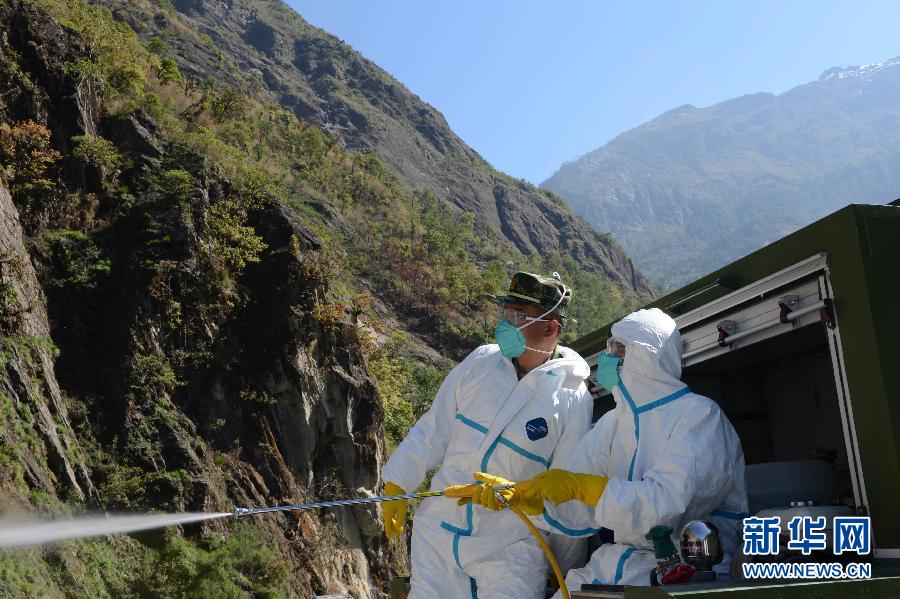 5月4日,卫生防疫队工作人员在樟木口岸进行喷雾消毒工作。应尼泊尔政府请求,由30名西藏自治区卫计委、自治区疾控中心人员组成的卫生防疫队,4日从樟木口岸进入尼泊尔开展跨国卫生防疫工作。新华社记者 觉果 摄