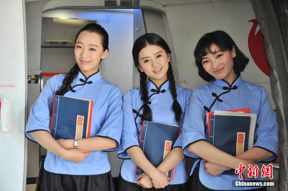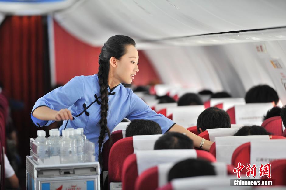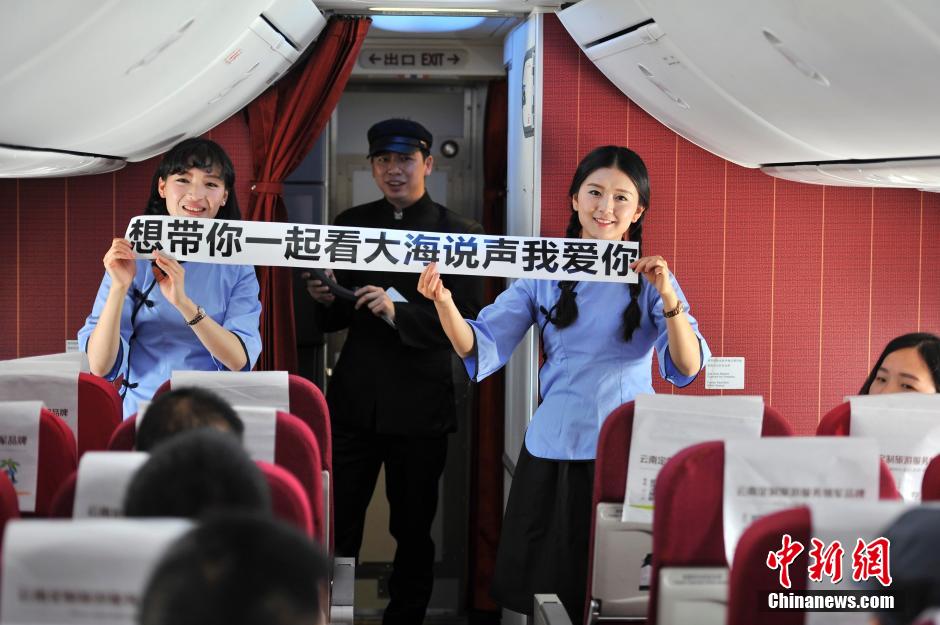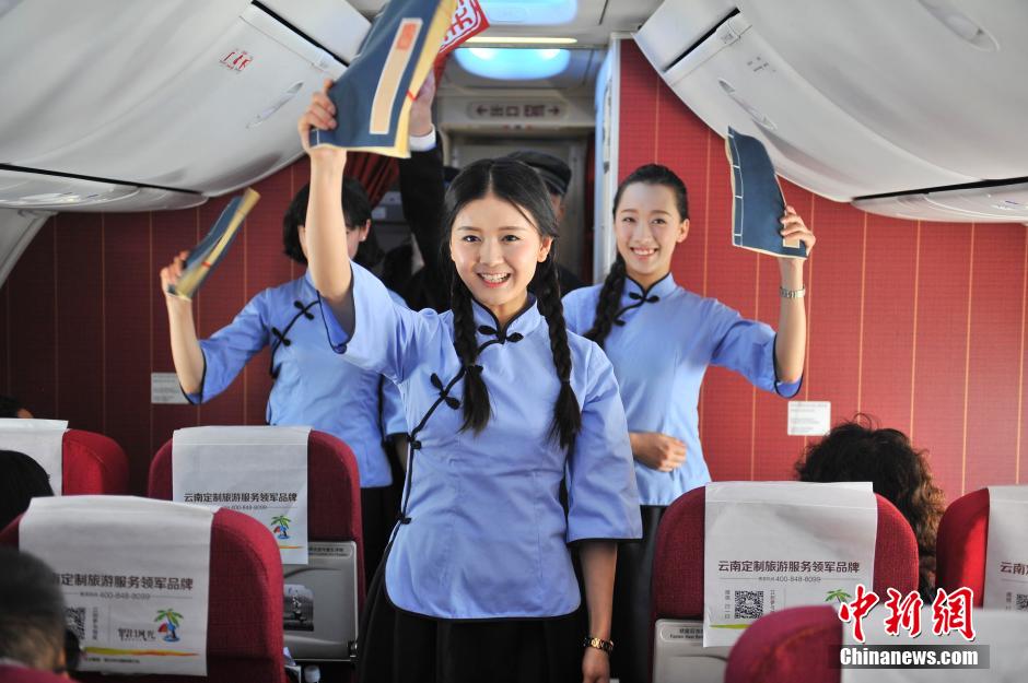 5月4日是五四青年节,祥鹏航空昆明飞往三亚的航班上,空乘身着复古学生装,化身“校园女神”,带领乘客共度一场别开生面的万米高空派对。中新社发 刘冉阳 摄