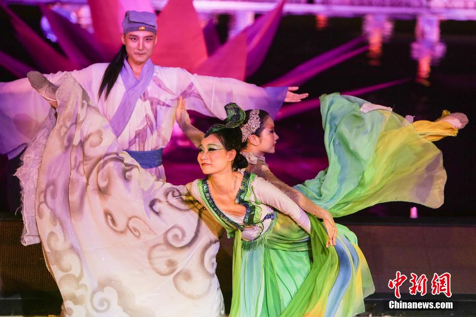5月4日晚,以中国四大民间传说之一《白蛇传》故事为蓝本的水景秀在江苏镇江金山湖畔上演。正在公演的水景秀《白蛇传》,是今年复排的新作,以金山寺的自然风貌为背景,用全彩激光与3D水幕投影相结合,从断桥相遇、盗取仙草到水漫金山,讲述了白娘子与许仙的动人爱情故事。田雯 摄