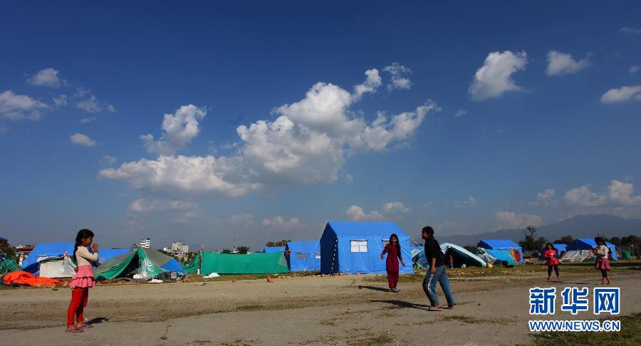 5月4日,在尼泊尔加德满都,停课的孩子们在临时安置点外玩耍。尼泊尔教育部称,在尼泊尔受地震影响最严重地区的所有大中小学将停课至5月14日。 新华社发(苏尼尔·夏尔马摄)