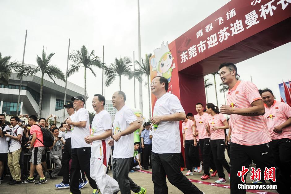 5月4日,“青春飞扬,‘苏’写精彩”迎苏迪曼杯长跑活动在东莞举行,东莞市市委书记徐建华、市长袁宝成,知名人士李宁、李永波、白岩松及林丹、蔡赟、傅海峰等15位奥运冠军、世界冠军前来助阵。 中新社发 陈骥旻 摄