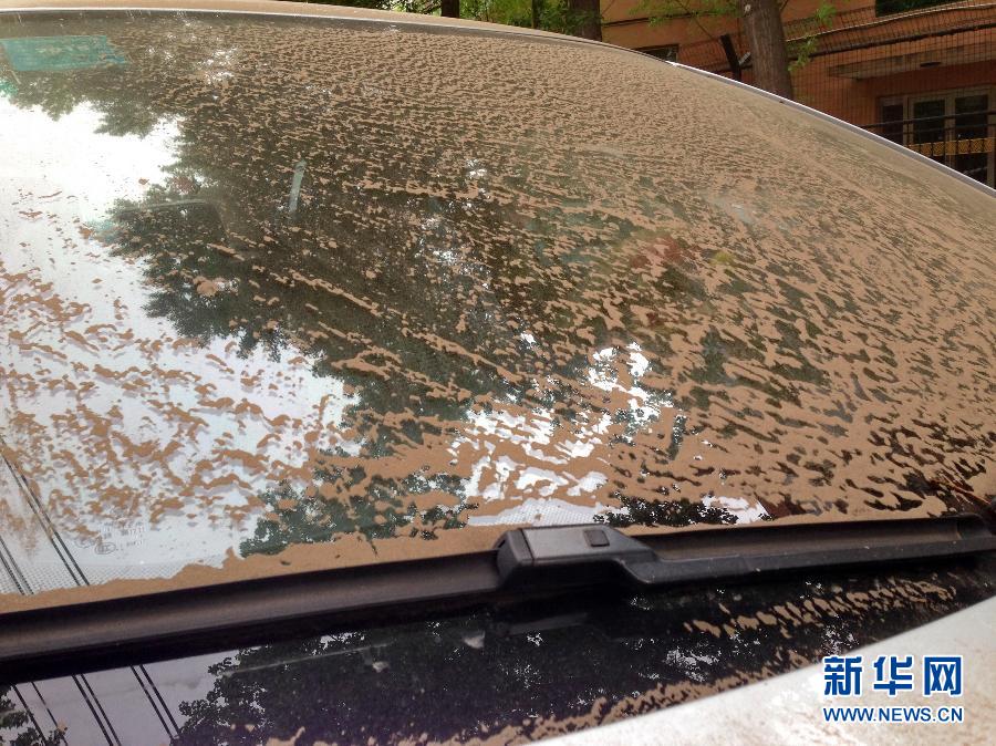 5月5日,在吉林省长春市文化街上,一辆汽车的风挡玻璃被大量沙尘覆盖(手机拍摄)。当日,吉林省气象台连续发布大风蓝色预警和沙尘蓝色预警:预计到5月6日上午,吉林大部分地区有6-7级偏西风,瞬时风力可达8级以上;预计长春等地的沙尘天气将持续到5日夜间。新华社记者张楠摄