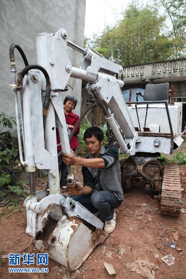 5月5日,在四川省内江市东兴区柳桥乡林坡村,代元武给自制的挖掘机换挖斗。近日,内江东兴区柳桥乡林坡村90后小伙代元武自制了一台挖掘机,吸引了乡亲们的目光。该挖掘机是代元武花费3个月时间设计拼装而成,花费约3万元。他为这台小型挖掘机设计了履带,同时增添了大小臂伸缩功能,以便于在狭小空间内作业,更加适合在农村使用。新华社发(兰自涛 摄)
