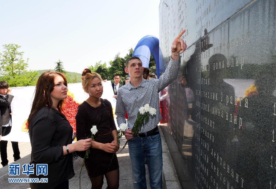 5月5日,几名俄罗斯留学生代表在参观刻有苏联援华抗日航空烈士英名的纪念碑。当日,江苏省暨南京市各界人士在南京抗日航空烈士纪念碑前举行凭吊苏联援华抗日航空烈士活动,追思为中国抗战事业献出生命的200余名苏联援华志愿航空队飞行员。抗战初期,苏联是率先援助中国抗日的国家。共计有1000多架飞机、2000余名飞行员与中国人民一起抗击日本侵略者,超过200名苏联飞行员血洒中国长空。新华社记者 孙参 摄
