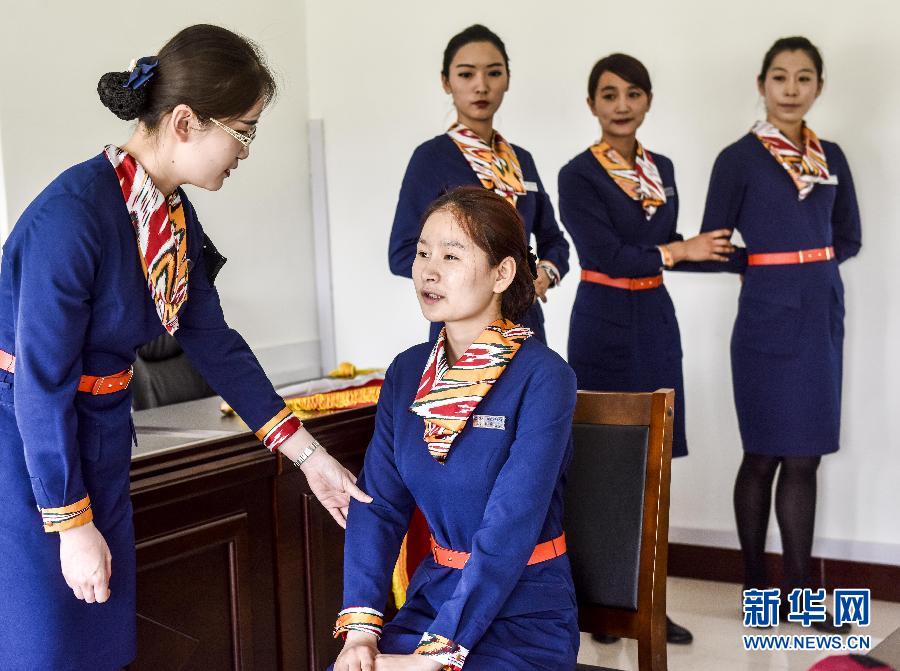兰新高铁自2014年12月26日开通后,越来越多的游客开始选择乘坐动车到新疆旅游,而动车上从事服务工作的乌鲁木齐客运段的“动姐”们更是成为展示新疆独特魅力的第一道风景线。目前,乌鲁木齐客运段动车队正在抓紧时间训练,准备迎接新疆旅游旺季的到来。乌鲁木齐客运段动车队成立于2014年7月1日,队员由汉、维吾尔、回、满和朝鲜等多民族组成,平均年龄24岁,致力于打造丝路上的“甜蜜高铁”。新华社记者 赵戈 摄