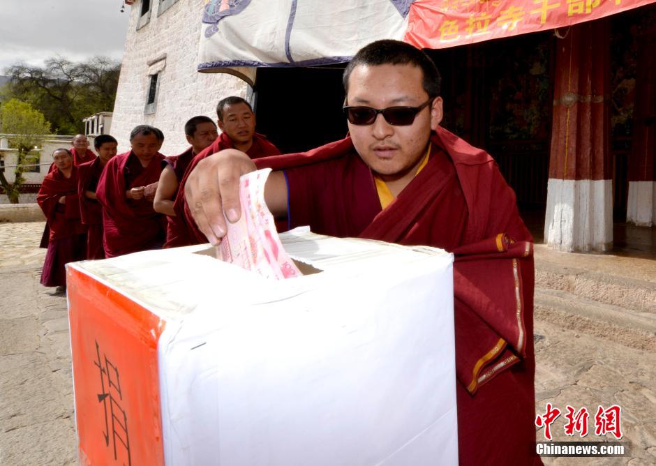 5月5日,正在色拉寺学习的热振寺活佛热振·索朗平措为地震灾区捐款。中新社发 李林 摄