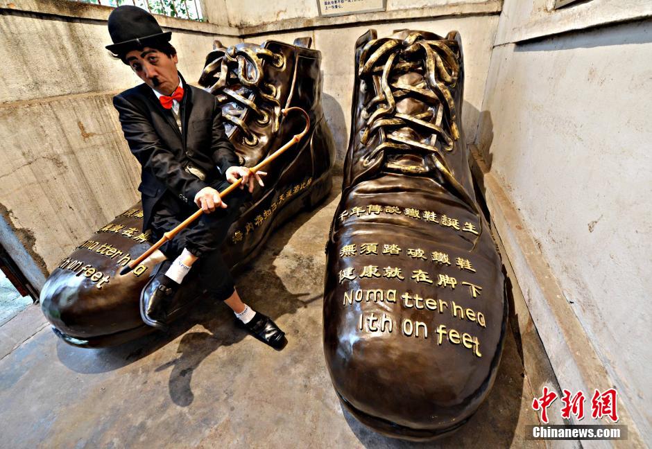 5月5日,打扮成卓别林模样的市民在巨鞋前合影留念。福州67岁的郑长凎老人自己设计,委托工厂历时半年经过三次制作,号称世界最大的“铜鞋”近日完工,吸引了许多市民前来观赏。据了解,这双巨鞋高1.3米,长2.3米,宽0.8米,重达1吨,花费了18万元制作。中新社发 张斌 摄
