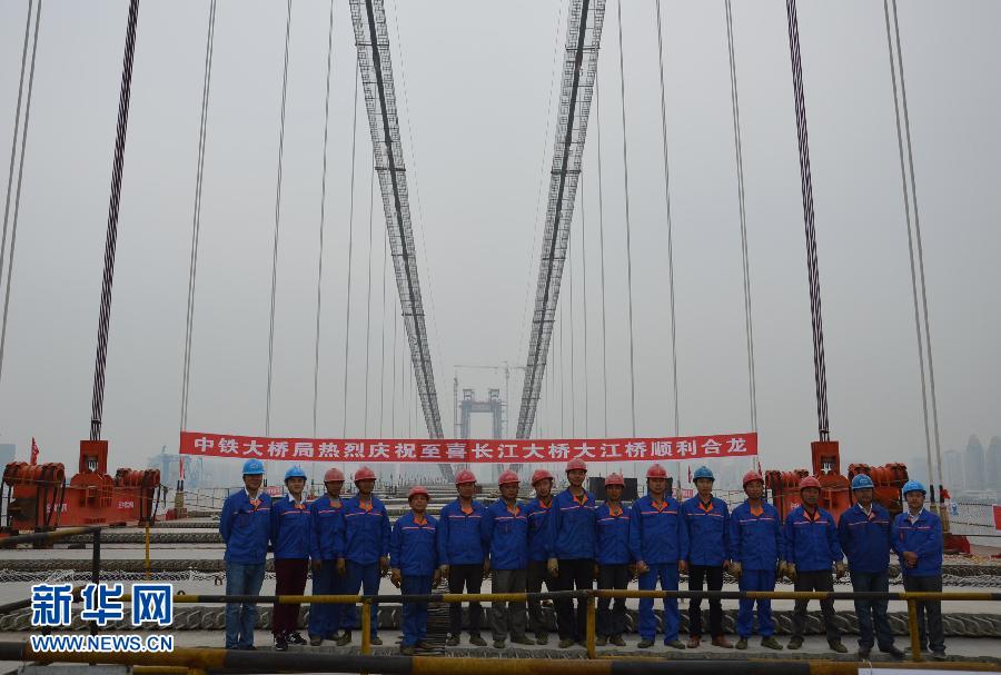 5月5日,工人们在葛洲坝至喜长江大桥主桥大江桥主桥合龙仪式上合影。当日,“万里长江第一坝”葛洲坝坝上公路替代用桥——至喜长江大桥主桥顺利合龙。至喜长江大桥位于葛洲坝下游约2.7公里处,全长3234米,双向6车道,项目投资27.5亿元。 新华社记者 梁建强 摄