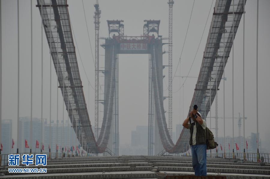 5月5日,一名摄影爱好者在顺利合龙的葛洲坝至喜长江大桥主桥上拍照。当日,“万里长江第一坝”葛洲坝坝上公路替代用桥——至喜长江大桥主桥顺利合龙。至喜长江大桥位于葛洲坝下游约2.7公里处,全长3234米,双向6车道,项目投资27.5亿元。 新华社记者 梁建强 摄