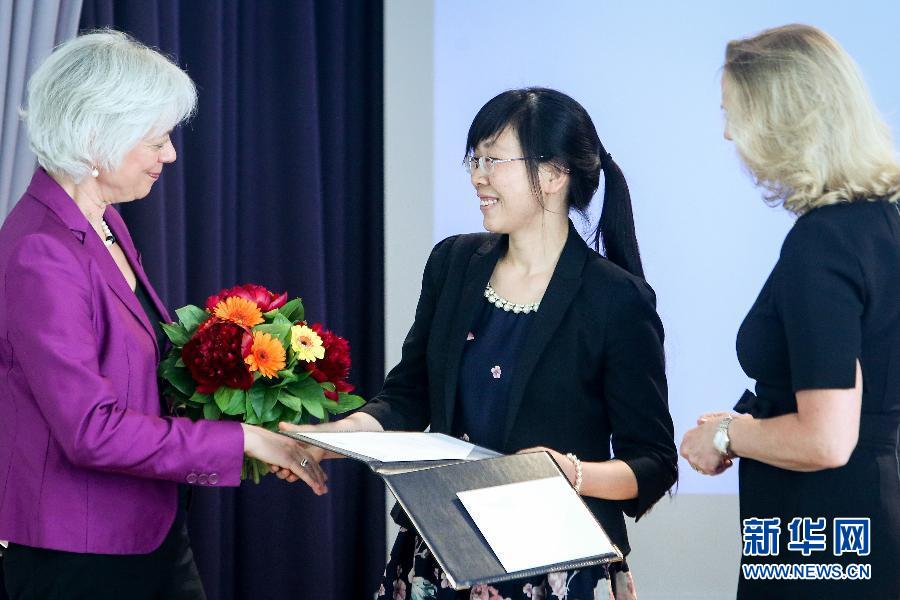5月5日,在德国柏林,朱晓香博士(中)在颁奖仪式上领奖。德国科学基金会和德国联邦教研部5日在柏林颁发2015年德国海因茨·迈尔-莱布尼茨奖,来自中国的朱晓香博士等10名青年科学家获奖。海因茨·迈尔-莱布尼茨奖由德国科学基金会于1977年设立,以德国科学基金会前任主席、核物理学家海因茨·迈尔-莱布尼茨教授名字命名,旨在表彰杰出的科研后备人才。现年30岁的朱晓香博士现在慕尼黑工业大学任教并担任荣誉教授,本次评选中她以其在远距离勘探领域的成就获奖。新华社记者张帆摄