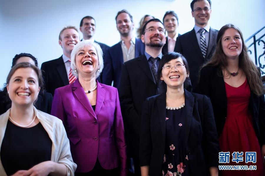 5月5日,在德国柏林,朱晓香博士(前左三)与其他获奖者在颁奖仪式前合影。德国科学基金会和德国联邦教研部5日在柏林颁发2015年德国海因茨·迈尔-莱布尼茨奖,来自中国的朱晓香博士等10名青年科学家获奖。海因茨·迈尔-莱布尼茨奖由德国科学基金会于1977年设立,以德国科学基金会前任主席、核物理学家海因茨·迈尔-莱布尼茨教授名字命名,旨在表彰杰出的科研后备人才。现年30岁的朱晓香博士现在慕尼黑工业大学任教并担任荣誉教授,本次评选中她以其在远距离勘探领域的成就获奖。新华社记者张帆摄