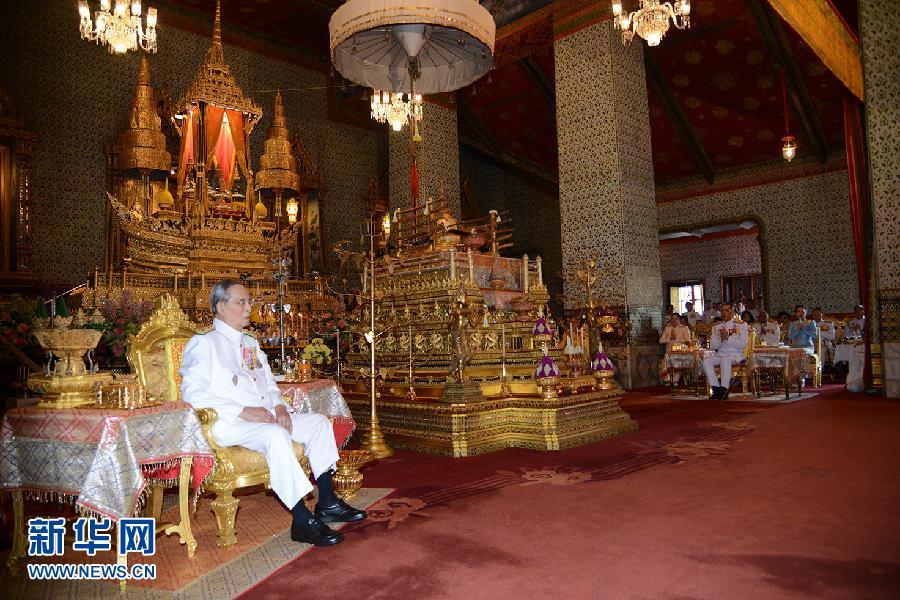 5月5日,泰国国王普密蓬·阿杜德(左一)出席在泰国曼谷大皇宫举行的加冕65周年庆典活动。泰国国王普密蓬·阿杜德5日出席了在曼谷大皇宫举行的加冕65周年庆典活动。这是87岁高龄的普密蓬国王自去年10月份住院以来罕见的公开露面。新华社发(泰国王室供图) 图片来源:新华网
