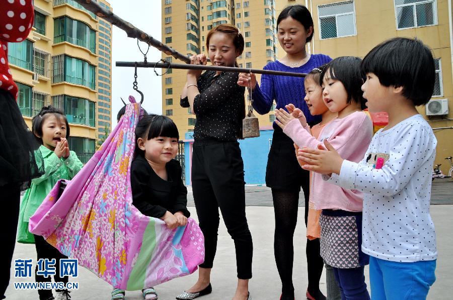 5月6日,在河北省成安县七色光幼儿园,老师在给小朋友称体重。当日是二十四节气中的“立夏”。多地开展称体重、碰鸡蛋等传统民俗活动,让人们了解立夏节气的由来和民俗习惯。 新华社记者 牟宇 摄