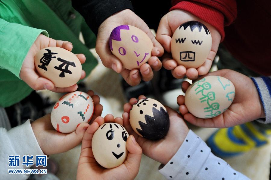 5月6日,在河北省成安县七色光幼儿园,小朋友在展示手绘的彩蛋。当日是二十四节气中的“立夏”。多地开展称体重、碰鸡蛋等传统民俗活动,让人们了解立夏节气的由来和民俗习惯。 新华社记者 牟宇 摄