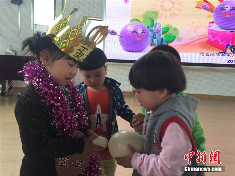 5月6日是二十四节气当中的立夏,“立夏斗蛋”作为传统习俗一直流传至今。孩子们三五成群,一般使用鸡蛋、鸭蛋或者鹅蛋加入“斗蛋”大军,而浙江省宁波市北仑区实验幼儿园的陈可薇则在学校的斗蛋比赛中,抱来了一枚2斤多重的驼鸟蛋,“巨无霸”硕大的身躯所向披靡,一举击败了其他参赛鸡蛋,坐拥“蛋王”称号。康莉 摄