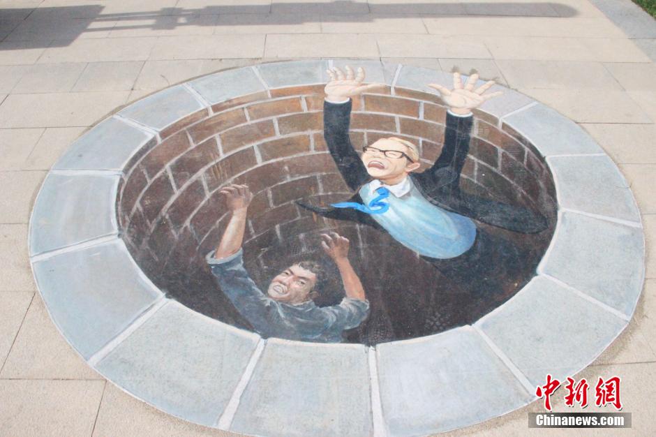 西安街头现3D立体画 逼真“悬崖瀑布”引围观